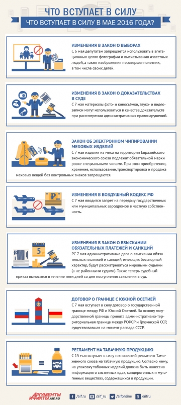 В мае 2016 года вступают в силу изменения в закон о выборах, изменения в закон о доказательствах в суде, закон об электронном чипировании меховых изделий, изменения в Воздушный кодекс РФ, изменения в закон о взыскании обязательных платежей и санкций, в договор о границе с Южной Осетией, регламент на табачную продукцию.