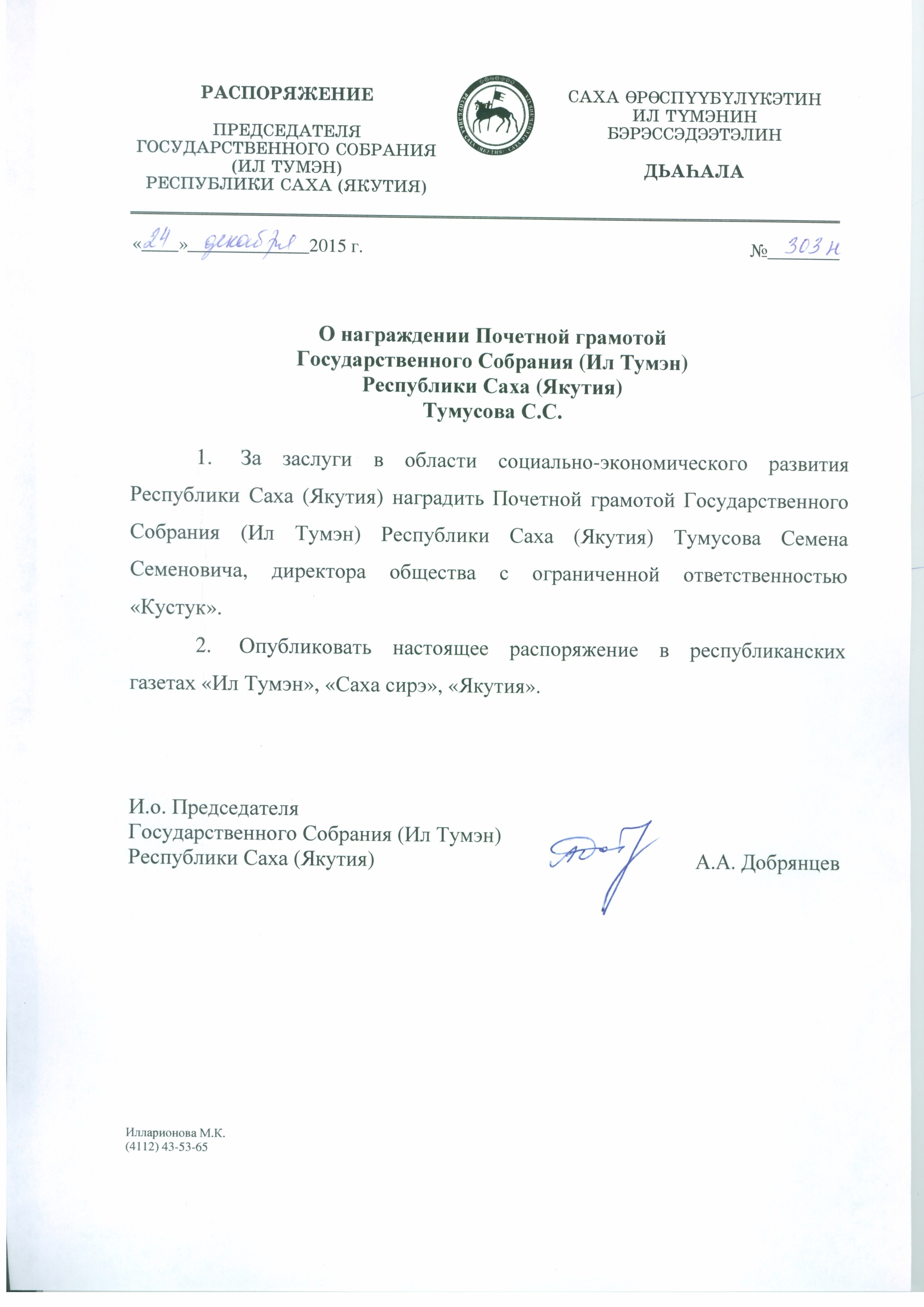 Награжден Почетной Грамотой Государственного Собрания (Ил Тумэн) РС (Я).