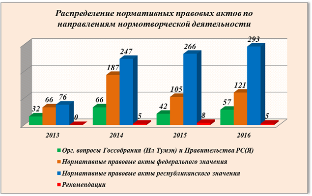 В 2016 году Государственным Собранием (Ил Тумэн) рассмотрено и поддержано 68 проектов федеральных законов, поддержаны 45 законодательных инициатив и обращений законодательных органов субъектов Российской Федерации и принято 7 законодательных инициатив Государственного Собрания (Ил Тумэн).