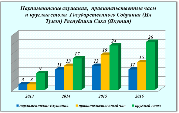 Одной из форм работы Государственного Собрания (Ил Тумэн) является организация и проведение парламентских слушаний, правительственных часов и круглых столов. За 2016 год Государственным Собранием (Ил Тумэн) проведено 11 парламентских слушаний, 15 правительственных часов и 26 круглых столов.