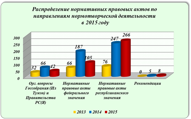 Государственным Собранием (Ил Тумэн) Республики Саха (Якутия) за отчетный период 2015 года принято 28 постановлений по протестам прокурора Республики Саха (Якутия), 71 постановление по проектам федеральных законов, 11 постановлений по законодательным инициативам и 19 – по обращениям в федеральные органы государственной власти законодательных (представительных) органов власти субъектов Российской Федерации.