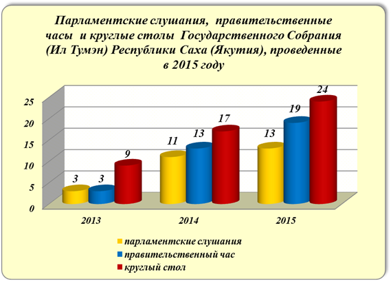 Одной из форм работы Государственного Собрания (Ил Тумэн) является организация и проведение парламентских слушаний, правительственных часов и круглых столов. За 2015 год Государственным Собранием (Ил Тумэн) проведено 13 парламентских слушаний, 19 правительственных часов и 24 круглых стола.