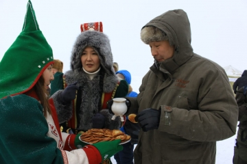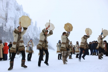 Мероприятие традиционно началось с национального обряда алгыс с благословением на успешный туристический сезон. Танец в исполнении эвенкийского фольклорного коллектива «Гиркилэн» на фоне заснеженных Ленских скал создал особенный колорит.