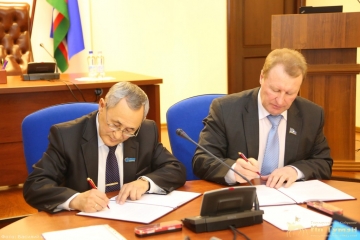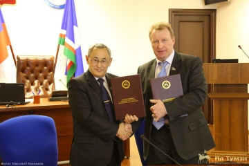Далее состоялась церемония подписания Соглашения. От имени Государственного Собрания (Ил Тумэн) Соглашение подписал первый заместитель спикера парламента Якутии Анатолий Добрянцев, от имени Общественной палаты республики – председатель Палаты Вячеслав Алексеев.