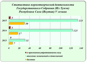 За 2015-ый год Государственным Собранием (Ил Тумэн) проведено семь пленарных заседаний и один расширенный Совет парламента республики, на которых принят 421 нормативный правовой акт, в том числе 166 законов Республики Саха (Якутия), из которых 30 являются базовыми, 133 – о внесении изменений и дополнений в региональные законы, 3 – о признании утратившими силу республиканских законов.