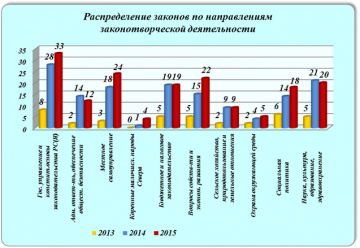 Если распределить законы по направлениям законотворческой деятельности, то в сфере государственного управления и конституционных основ законодательства республики принято 58 нормативных правовых акта, из них 33 закона; в сфере местного самоуправления – 42 нормативных правовых акта, в том числе 24 закона, в сфере бюджетного и налогового законодательства принято 27 нормативных правовых актов, из которых 19 законов.