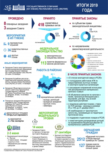 За 2019 год Государственным Собранием (Ил Тумэн) Республики Саха (Якутия) VI созыва проведено 8 пленарных заседаний и 3 заседания Совета парламента, на которых принято 418 нормативных правовых актов, в том числе: 123 закона, из которых 7 базовых, и 295 постановления.