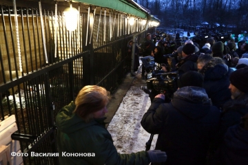 Далее Глава Республики Саха (Якутия) Егор Борисов и губернатор Санкт-Петербурга Георгий Полтавченко одновременно открыли шиберные перегородки и выпустили Хаарчаану из берлоги на всеобщее обозрение.