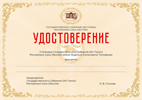СТИПЕНДИЯ ГОСУДАРСТВЕННОГО СОБРАНИЯ (ИЛ ТУМЭН) РЕСПУБЛИКИ САХА (ЯКУТИЯ) ИМЕНИ НЬУРГУНА СЕМЕНОВИЧА ТИМОФЕЕВА