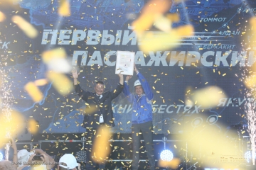 Официальная часть праздничного митинга завершилась передачей акта о технической готовности пускового комплекса «Томмот-Якутск (Нижний Бестях) участка Томмот-Якутск железнодорожной линии Беркакит-Томмот-Якутск» генеральному директору «ЖДЯ» Василию Шимохину.