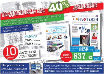 За 10 дней жители республики смогут подписаться на парламентскую газету «Ил Тумэн» со скидкой 40%. Цена на 6 мес. 2018 года — 837, 42 рублей