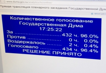 В результате открытого голосования на «часе голосования» проект федерального закона «О внесении изменения в статью 1 Федерального закона «О контрактной системе в сфере закупок товаров, работ, услуг для обеспечения государственных и муниципальных нужд», инициированный парламентом Якутии, принят в первом чтении. Законопроект поддержали 432 депутата Государственной Думы, что составляет 96% от всего количества парламентариев Госдумы.