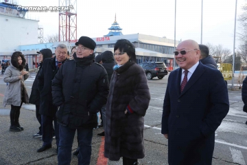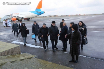 Почетных гостей тепло и радушно приветствовали коллеги из Калмыкии. Согласно калмыцким традициям девушки в национальных костюмах преподнесли спустившимся с трапа самолета депутатам джомбу и борцоги, вручили белые хадаки.