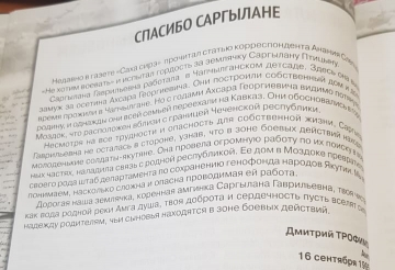 От имени Государственного Собрания (Ил Тумэн) Республики Саха (Якутия) поздравляю вас с 80-летием! Мы помним вашу доброту, неоценимую помощь Саргыланы Гаврильевны, вас лично нашим солдатам якутянам, служившим в Чечне в грозное и суровое время.