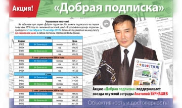Редакция парламентской газеты запустила акцию «Добрая подписка», в рамках которой каждый желающий может подарить подписку на газету «Ил Тумэн» социальным учреждениям г. Якутска и районов республики.
