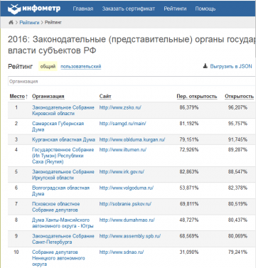 Победителями рейтинга региональных парламентов в 2016 году стали Законодательное Собрание Кировской области, Самарская Губернская Дума и Курганская областная Дума. Общая степень открытости сайтов всех региональных законодательных органов власти России составила 55,062%. В прошлом году этот показатель был равен 52,43%.