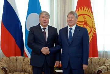 Алмазбек Атамбаев тепло поприветствовал почетного гостя, отметив, что рад вновь встретиться. Глава Кыргызстана также выразил благодарность Александру Жиркову за участие в Форуме алтайской цивилизации.