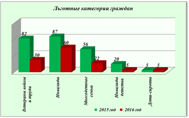 Отмечается тенденция снижения обращений одиноких матерей – 5 (21), многодетных семей – 22 (60), молодых семей – 4 (28), детей-сирот – 5 (9) по различным вопросам предоставления социальных выплат. Необходимо отметить и заметное снижение обращений от ветеранов войны, тыла и труда – 30 (82).
