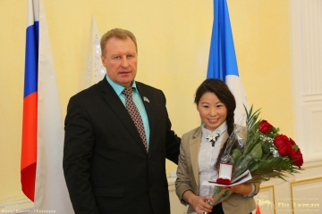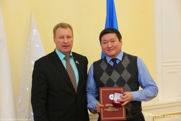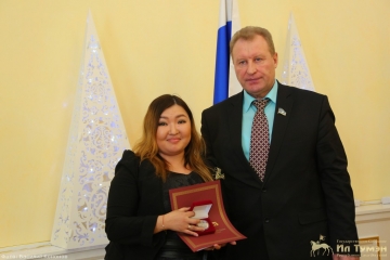 Далее первый вице-спикер парламента Анатолий Добрянцев от имени Государственного Собрания (Ил Тумэн) Республики Саха (Якутия) вручил награды лучшим журналистам по итогам 2015 года.