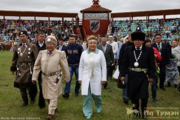 Председатель Совета Федерации Федерального Собрания Российской Федерации Валентина Матвиенко поздравила всех с древним праздником Земли олонхо – Ысыахом. «Ысыах – это праздник плодородия, трудолюбия, новых надежд, и здорово, что якутский народ так бережно хранит свою культуру и свои традиции. В этом празднике и душа, и традиции, и культура якутского народа. Якутия – многонациональная республика и замечательно, что этот праздник стал общенародным, и в Ысыахе принимают участие все народы, проживающие в Якутии», - сказала она. Валентина Матвиенко отметила, что нынешний Ысыах посвящён 70-летию Великой Отечественной войны. «Представители Якутии проявляли мужество и героизм в годы войны, 24 человека были награждены званием Героя Советского Союза, несколько человек стали полными кавалерами ордена Славы трёх степеней», - отметила она и вспомнила легендарного якутского снайпера Фёдора Матвеевича Охлопкова, имя которого «навсегда вписано в историю нашей страны». «Народ, у которого такие сыны, никогда не будет побеждён и никогда не будет покорён!» - подчеркнула она.