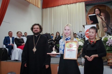Архиепископ Якутский и Ленский Роман и председатель жюри Светлана Соколова наградили лауреатов первого конкурса документальных фильмов и телевизионных сюжетов о православии по номинациям «Телевизионная программа», «Документальный фильм», «Телевизионный сюжет».