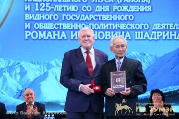 Глава Эвено-Бытантайского улуса Иван Горохов вручил народному писателю республики Андрею Кривошапкину юбилейный знак «125 лет Роману Шадрину».