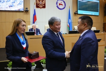 От имени Государственного Собрания (Ил Тумэн) пятого созыва спикер якутского парламента Александр Жирков поздравил Василия Потапова с назначением его на должность заместителя главы Мирнинского района и вручил Благодарственное письмо Председателя Государственного Собрания (Ил Тумэн) Республики Саха (Якутия).
