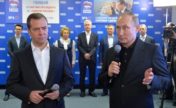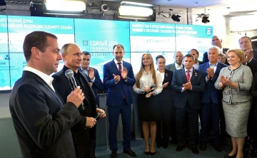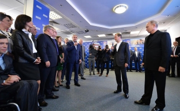 После закрытия избирательных участков Президент Российской Федерации Владимир Путин вместе с Председателем Правительства РФ Дмитрием Медведевым посетили избирательный штаб партии «ЕДИНАЯ РОССИЯ».