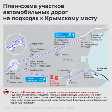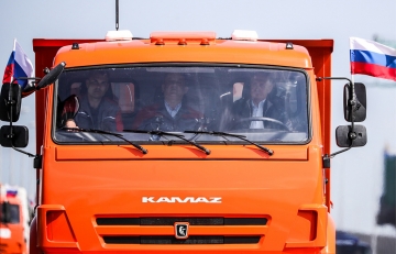 Президент России Владимир Путин 15 мая 2018 года дал старт работе автомобильной части Крымского моста, отправившись с нулевого километра во главе колонны строительной техники по мосту в сторону Керчи. Глава государства сел за руль "КамАЗа", на месте пассажира находился генеральный директор компании "СГМ-Мост" Александр Островский.