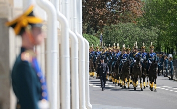 Через Георгиевский и Александровский залы в Андреевский зал прошли солдаты Президентского полка с Государственным флагом РФ, Штандартом Президента России, специальным экземпляром Конституции и Знаком Президента РФ.