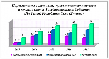Одной из форм работы Государственного Собрания (Ил Тумэн), наряду с пленарными заседаниями, является организация и проведение парламентских слушаний, правительственных часов и круглых столов. За 2017 год Государственным Собранием (Ил Тумэн) проведено 10 парламентских слушаний, 21 правительственный час и 31 круглый стол. В мероприятиях, проведенных парламентом Якутии, принимали активное участие народные депутаты республики, члены Правительства Якутии, руководители и ответственные работники республиканских министерств и ведомств, председатели и депутаты районных и наслежных советов депутатов, представители муниципальных образований, общественных организаций, средств массовой информации, общественность республики.
