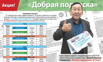 «Добрая подписка» — социальная акция Издательского дома «Ил Тумэн». Подписываясь в рамках акции на наши издания, вы помогаете получать актуальные новости и острые материалы о злободневных проблемах, полезные материалы из мира законодательства для социальных учреждений и социально уязвимых слоев населения — пенсионеров и инвалидов.