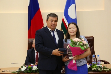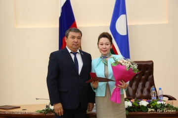 Народный депутат Якутии вручил Почетную грамоту Государственного Собрания (Ил Тумэн) Республики Саха (Якутия) за заслуги в области социально-экономического развития республики Наталье Ефимовой и объявил Благодарность Председателя Государственного Собрания (Ил Тумэн) Республики Саха (Якутия) Саргылане Слепцовой.