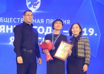 Председатель постоянного комитета Ил Тумэна по делам семьи и детства Алена Атласова вместе с журналистом, заместителем главного редактора газеты «Якутск вечерний» Виталием Обединым вручила одной из лауреатов общественной премии «Якутянин года-2018. Якутск», заместителю председателя Всероссийской организации родителей детей-инвалидов по Якутии, организатору работы с детьми с аутизмом Инне Скрябиной памятный диплом и медаль из серебра 925 пробы, изготовленную по уникальному эскизу ювелирной компании «Киэргэ».