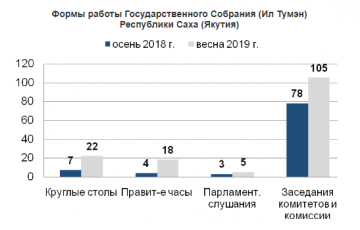 Одной из форм работы Государственного Собрания (Ил Тумэн) является организация и проведение парламентских слушаний, правительственных часов и круглых столов. За весеннюю сессию 2019 года Государственным Собранием (Ил Тумэн) проведено 5 парламентских слушаний, 18 правительственных часов и 22 круглых стола.