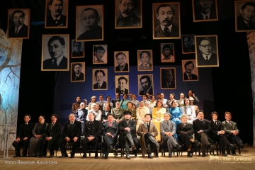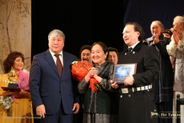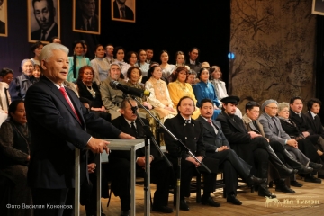 Торжественный вечер начался с театрализованной композиции «Тэпсиллибэт үтүө ааттар» в исполнении артистов Саха академического театра имени П.А. Ойунского.