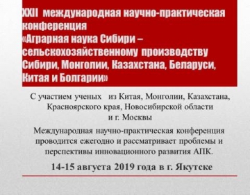 XXII международная научно-практическая конференция «Аграрная наука – сельскохозяйственному производству Сибири, Монголии, Казахстана, Беларуси, Китая и Болгарии», посвященная 50-летию СО РАСХН и 70-летию Якутского научного центра Сибирского отделения Российской академии наук, состоится в столице Якутии 14-15 августа 2019 года.