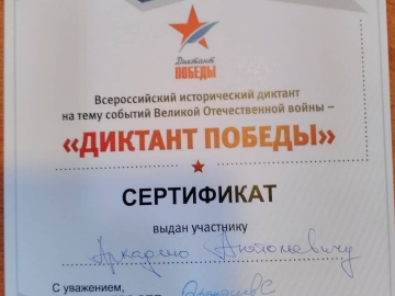 «Нужно было в течение 45 минут ответить на 20 вопросов. Хочу сразу отметить, вопросы были очень сложными, и, по-моему, я не на все ответил правильно. Но тем и лучше, это будет стимулом для дальнейшего ознакомления с теми событиями Великой Отечественной войны, о которых я, к сожалению, не знал», - отмечает Аркадий Семенов.