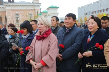 Под музыкальное сопровождение участники торжественного открытия, приглашенные гости, ученики близлежащей школы возложили свежие цветы к памятнику выдающемуся сыну якутского народа Илье Егоровичу Винокурову.