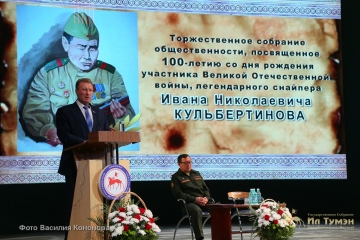 Открывая торжественное собрание, заместитель Председателя Правительства республики Михаил Гуляев обратил внимание участников мероприятия на то, что имя легендарного снайпера Ивана Кульбертинова будет присвоено одной из улиц города Якутска и центральным событием в увековечении его памяти является установка в столице республики бронзового памятника в 2018 году.