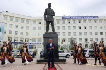 На площади перед Медицинским институтом СВФУ им. М.К. Аммосова сегодня состоялась церемония возложения цветов памятнику выдающемуся государственному и политическому деятелю тюркских народов Максиму Кировичу Аммосову.