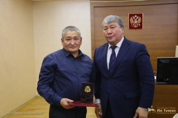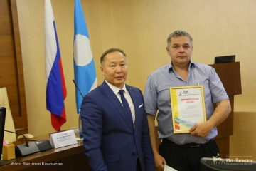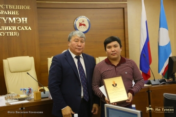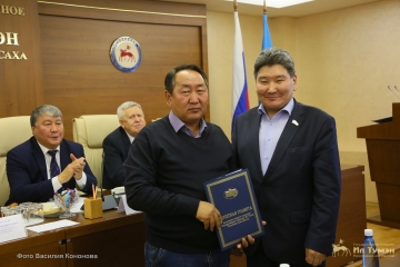 Юрий Николаев вручил Почетную грамоту постоянного комитета Ил Тумэн по бюджету, финансам, налоговой и ценовой политике, вопросам собственности и приватизации Спартаку Слепцову, Почетную грамоту постоянного комитета Ил Тумэн по здравоохранению, социальной защите, труду и занятости Николаю Афанасьеву.