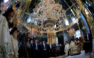 В Карее, административном центре Афона, вместе с протоэпистатом Святой Горы отцом Павлом и братией глава Российского государства присутствовал на молебне в храме Успения Пресвятой Богородицы, по окончании которого обратился к присутствующим с приветственной речью.