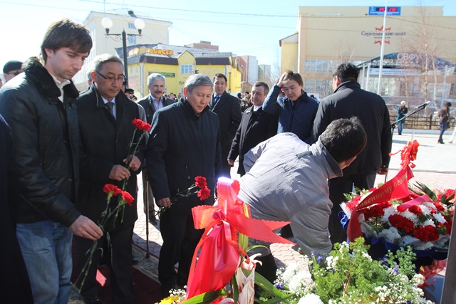 Народные депутаты Республики Саха (Якутия), члены Правительства Якутии, представители органов федеральной исполнительной власти и органов государственной власти республики, представители делегации Намского улуса – земляки одного из основателей Якутской АССР М.К. Аммосова, общественность республики 27 апреля 2014 года приняли участие в церемонии возложения цветов к памятникам основателям государственности Якутии Максиму Аммосову, Платону Ойунскому, Алексею Кулаковскому.