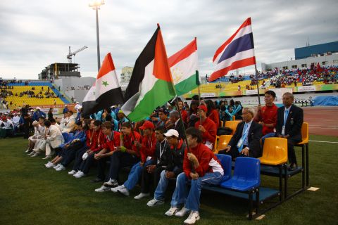 Восемь спортсменов-победителей V Международных спортивных игр «Дети Азии» - Танавут Нунчан (Таиланд), Мансур Зарипов (Татарстан), Шень Юэй (Китай), Мунтаси Бахар (Палестина), Мерген Дэлгерма (Монголия), Ахмедли Иман (Азербайджан), Пахманипича Афшин (Иран), Елизавета Королькова (Москва) передали флаг Игр вице-президенту Якутии Дмитрию Глушко.