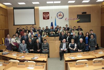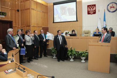 От имени народных депутатов Госсобрания (Ил Тумэн) первого созыва юбиляра поздравил председатель комитета Палаты представителей по законности и внешним связям, ныне заведующий кафедрой уголовного права и процесса Северо-Восточного федерального университета имени М.К. Аммосова, профессор, заслуженный юрист России Макар Яковлев.