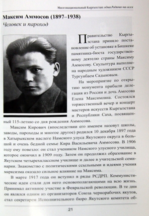 “Максим Аммосов Кыргызтаҥҥа баара суоҕа аҕыс эрэ ый үлэлээбитэ. Кылгас кэм иһигэр Максим Кирович саҥа үөскээбит советскай республика сайдар суолун торумнаспыта, сүнньүнэн тыа хаһаайыстыбатынан дьарыктанар дойду индустриальнай-аграрнай республикаҕа кубулуйар оҥкулун оҥорбута. М.К. Аммосов бу дойду экономиката, культурата сайдарыгар бэйэтин баай уопутун, чаҕылхай тэрийэр талаанын, күүһүн-уоҕун биэрэн туран үлэлээбитэ, государственнай үлэҕэ олохтоох кадрдары күүскэ киллэрбитэ, оттон репрессия ыар сылларыгар бу дьонун бэйэтин да харыстаммакка көмүскэспитэ. Ол иһин Максим Кирович Аммосов аатын бүгүҥҥэ диэри Кыргызтан дьоно-сэргэтэ умнубат”, - диэн бу кинигэ тахсыытын туһунан Кыргызтаҥҥа М.К. Аммосов аатын үйэтитиигэ аналлаах тэрээһиннэри салайбыт Ил Түмэн вице-спикерэ Александр Жирков бэйэтин санаатын үллэһиннэ.
