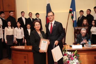Отмечая профессионализм и ответственность редколлегии в издании якутского текста Конституции РФ вице-президент Дмитрий Глушко вручил Благодарственное письмо Президента республики научному сотруднику сектора лексикологии Института гуманитарных исследований и проблем малочисленных народов Севера СО РАН Альбине Николаевой, старшему преподавателю кафедры стилистики якутского языка и русско-якутского перевода Института языков, культуры народов северо-востока Российской Федерации Северо-Восточного федерального университета имени М.К. Аммосова, кандидату филологических наук Надежде Гаврильевой, начальнику управления документационного обеспечения аппарата Государственного Собрания (Ил Түмэн) республики Марии Алексеевой, руководителю отдела перевода администрации Президента и Правительства Якутии Гаврилу Максимову, заместителю руководителя Департамента по внутренней политике администрации Президента и Правительства республики Эльвире Мярикяновой.