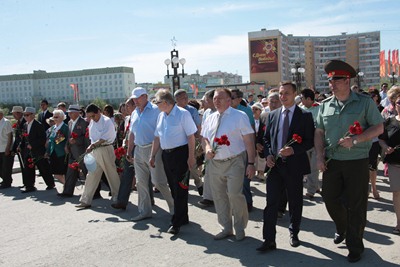 На траурном митинге и церемонии возложении цветов к монументу «Воинам-победителям» на Площади Победы Якутска приняли участие народные депутаты Якутии, члены Правительства республики, представители министерств и ведомств, руководство Окружной администрации столицы республики, руководители федеральных структур, ветераны Великой Отечественной войны и тыла, представители политических партий, общественных объединений молодёжи, учащиеся школ, жители и гости Якутска.