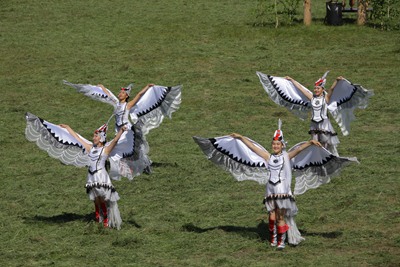 Затем с курлыканьем на сцену «прилетели» стерхи-девушки. Считается, что тот, кто увидит танцующих священных птиц - стерхов, будет счастлив всю жизнь. Далее состоялся обряд «Салама баайыыта», которую исполнили девушки под звуки якутского музыкального инструмента кырыымпа. У народа саха считается, что салама соединяет срединный мир с миром верховных божеств Айыы.